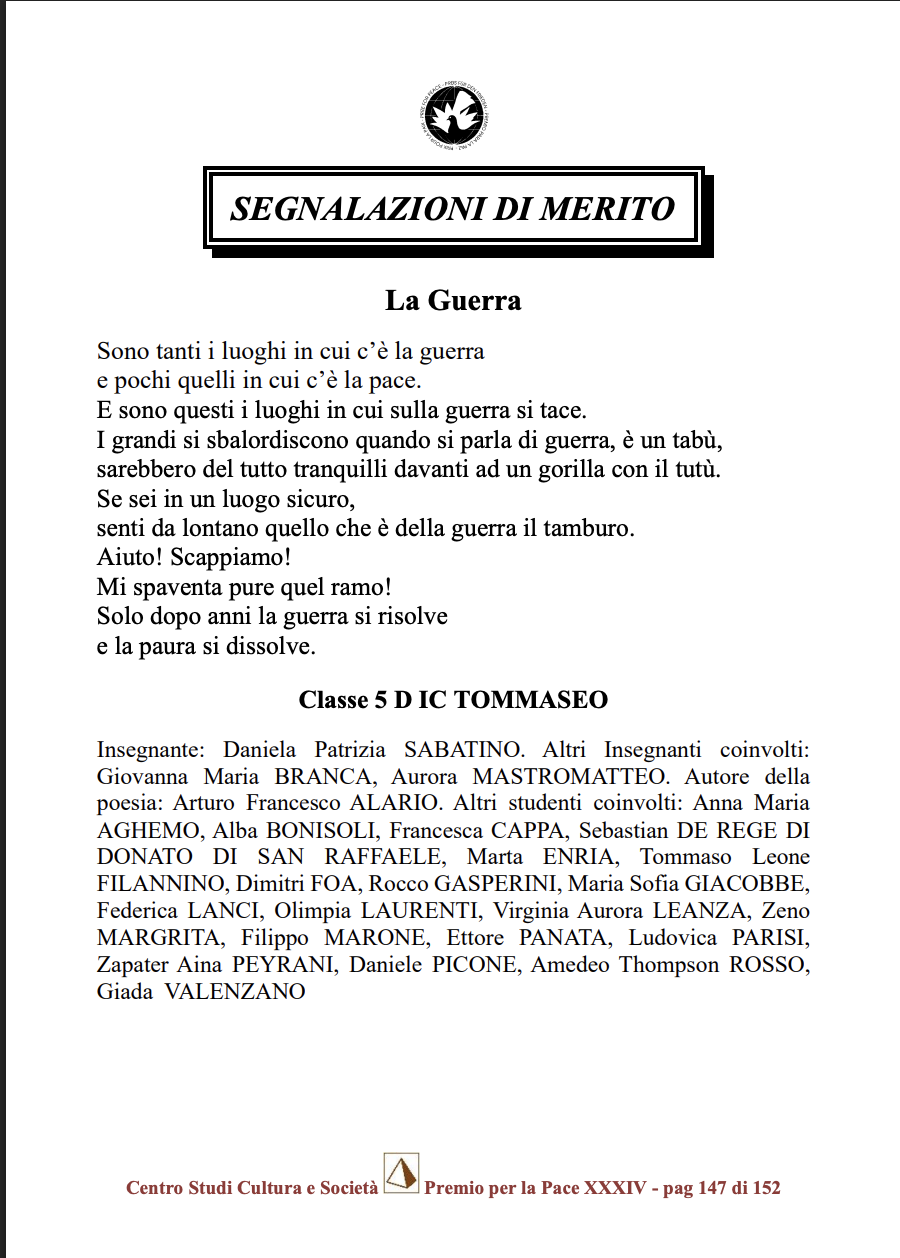 La Commissione giudicatrice ha conferito la Menzione Speciale (Sezione Scuole) alla poesia dal titolo “La Guerra”, opera dello studente Arturo Francesco Alario della classe 5 D. Il testo si è distinto tra i numerosi contributi per la maturità espressiva e la capacità di tradurre in versi i sentimenti di incertezza e la speranza legati ai conflitti del nostro tempo.